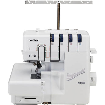Add a splash of professional-looking stitches with the versatile, durable AIR1800 Air Serger. The AIR1800 is an excellent addition to any sewing room and has a list of convenient features that includes an error LED indicator light that will notify when the fabric cover is open, a pair of quick-change levers for the rolled hemstitch feature, and a switch that will activate and deactivate the cutting knife. Youll be floating on air when it comes time to change threads on the AIR1800. The threading ports are connected to the end of each looper by tubes, and at the touch of a button, a blast of air sends the threads through the loopers, so it's a cinch to change thread colors. Youll be walking on air after adding finishing touches to your next project with the AIR1800 Air Serger.