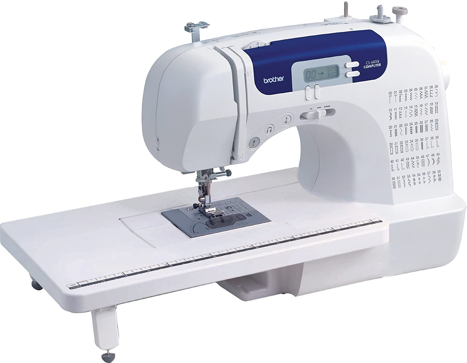 This user-friendly and portable sewing and quilting machine offers a wide range of quilting and sewing features at an affordable price. The CS6000i features 60 built-in sewing stitches, including decorative stitches and 7 styles of one-step buttonholes. There are 9 presser feet included in this machine - buttonhole, overcasting, monogramming, zipper, zigzag, blindstich, button fitting, walking, and spring action quilting foot. This machine also includes a detachable wide table that is perfect for larger quilting projects. The Brother CS6000i sewing machine has been engineered for ease of use. A simple-to-view backlit LCD display, an automatic needle threader, easy-to-follow threading diagrams, and an adjustable sewing speed control system are all included. An easy-to-see, brightly lit sewing area is quite helpful when sewing on dark fabrics. An automatic needle threader has been added to perfectly align thread through the needle. A built-in free arm helps to assist with sewing pant legs, sleeves, and other cylindrical items. The CS6000i sewing machine also includes a hard machine case, making it a perfect traveling sewing machine. The CS6000i sewing and quilting machine includes a printed Quick Start guide and complete instructions manuals in English and Spanish. We do not recommend using this machine in countries that do not support 120V AC, even if a voltage adapter is in use.