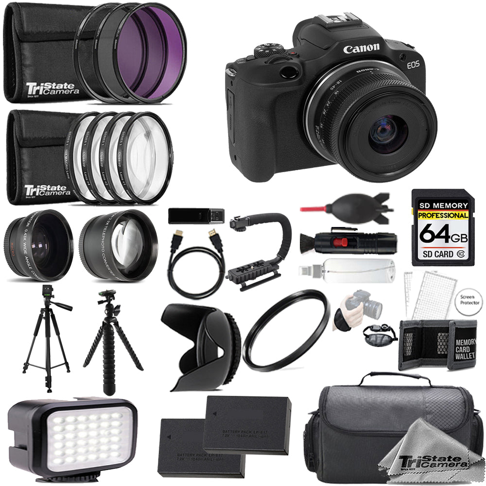 About Canon EOS R100 Mirrorless Camera with 18-45mm Lens (Black) + 64GB + Extra Battery+ 9 PC Filter- ULTIMATE Kit