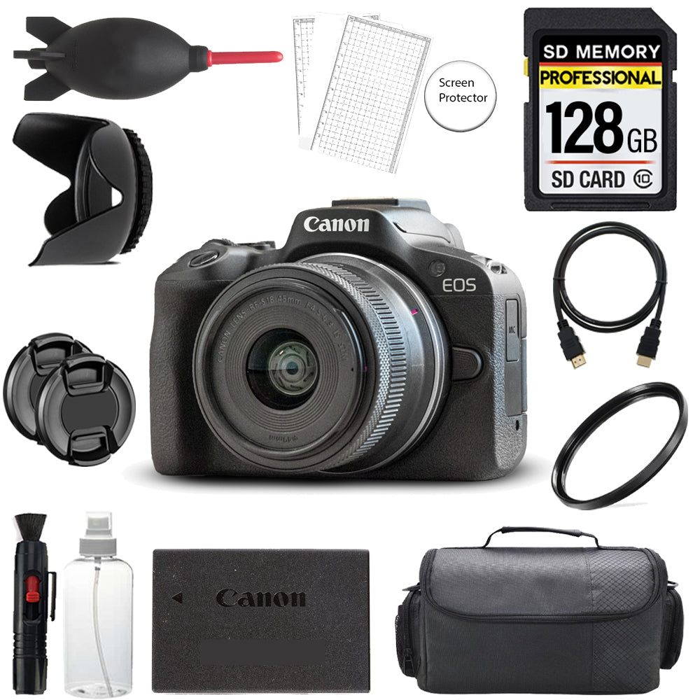 Canon EOS R50 Mirrorless Camera with 18-45mm Lens (Black) + 128GB + Bag+ UV Filter- Basic Kit