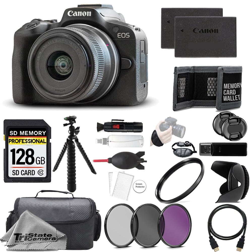 Canon EOS R50 Mirrorless Camera with 18-45mm Lens (Black) + 128GB + Extra Battery+ 3 PC Filter- Accessory Kit