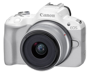 Bundling a sophisticated camera body with a versatile lens, the Canon EOS R50 Mirrorless Camera with 18-45mm Lens pairs the white multimedia mirrorless camera with the white RF-S 18-45mm f/4.5-6.3 IS STM standard zoom lens. A compact and lightweight camera, the white Canon EOS R50 is a highly versatile mirrorless camera with a sophisticated photo and video feature set. Geared towards content creators and vloggers, this camera is slightly smaller and lighter than the EOS M50 Mark II and features an upgraded 24.2MP APS-C CMOS sensor and DIGIC X image processor to deliver high-resolution stills and UHD 4K videos. Pairing a powerful 24.2MP APS-C CMOS sensor and DIGIC X image processor, the R50 delivers high resolution imagery with striking and accurate colors. Designed to work in a variety of lighting condition, this camera offers a flexible ISO 100-32000 range that is expandable to ISO 51200 for working in difficult lighting conditions. Using the full width of the sensor, 6K oversampled UHD 4K 30p video recording is supported as is Full HD 1080 120p for slow motion playback. Additionally, 1-hour of video recording is now available. Capable of processing high speed bursts and high-resolution 4K video, the DIGIC X image processor also supports up to 15 fps continuous shooting via its silent electronic shutter. Providing high-resolution eye-level viewing, the R50 is designed with a bright and clear 2.36m-dot OLED EVF for a pleasing electronic viewfinder experience. Additionally, a large 3.0" 1.62m-dot vari-angle touchscreen provides an intuitive interface for controlling focusing points, navigating menus, and reviewing imagery. This screen also features a vari-angle design for ease-of-use when working from high and low angles. Experience the joy of creative photography with an expanded array of auto-compatible scenes. Advanced A+ Assist enables great imagery even in difficult settings such as night views and backlit scenarios. Overexposure is automatically reduced so you can capture dynamic scenes or bright portraits, and multiple continuous shots are taken to create beautiful night images or macro photography with a deeper depth of field. Ensure the correct subject is in focus with Movie for Close-Up Demos Mode on the R50 mirrorless camera. This mode quickly switches focus from the on-camera subject to an object that is presented towards the camera's lens, ideal for movies where showing a product to the viewers is necessary such as in makeup demos or cooking videos. A versatile zoom range in a compact package is the promise of the white Canon RF-S 18-45mm f/4.5-6.3 IS STM Lens. Made specifically for Canon's APS-C-format R Series mirrorless line, it delivers a wide-angle to short telephoto equivalent zoom range of 29-72mm. Plus, a retractable design makes it ideal for everyday carry where you want to stuff the camera in a bag.