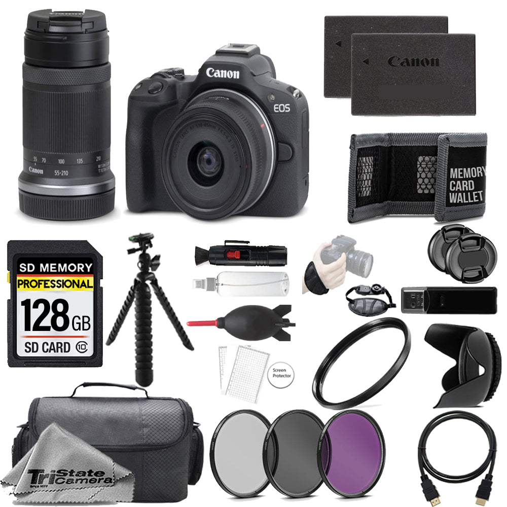 Canon EOS R50 Mirrorless Camera w/ 18-45mm IS STM & 55-210mm IS STM Lenses (Black) + 128GB + Extra Battery+ 3 PC Filter- Accessory Kit