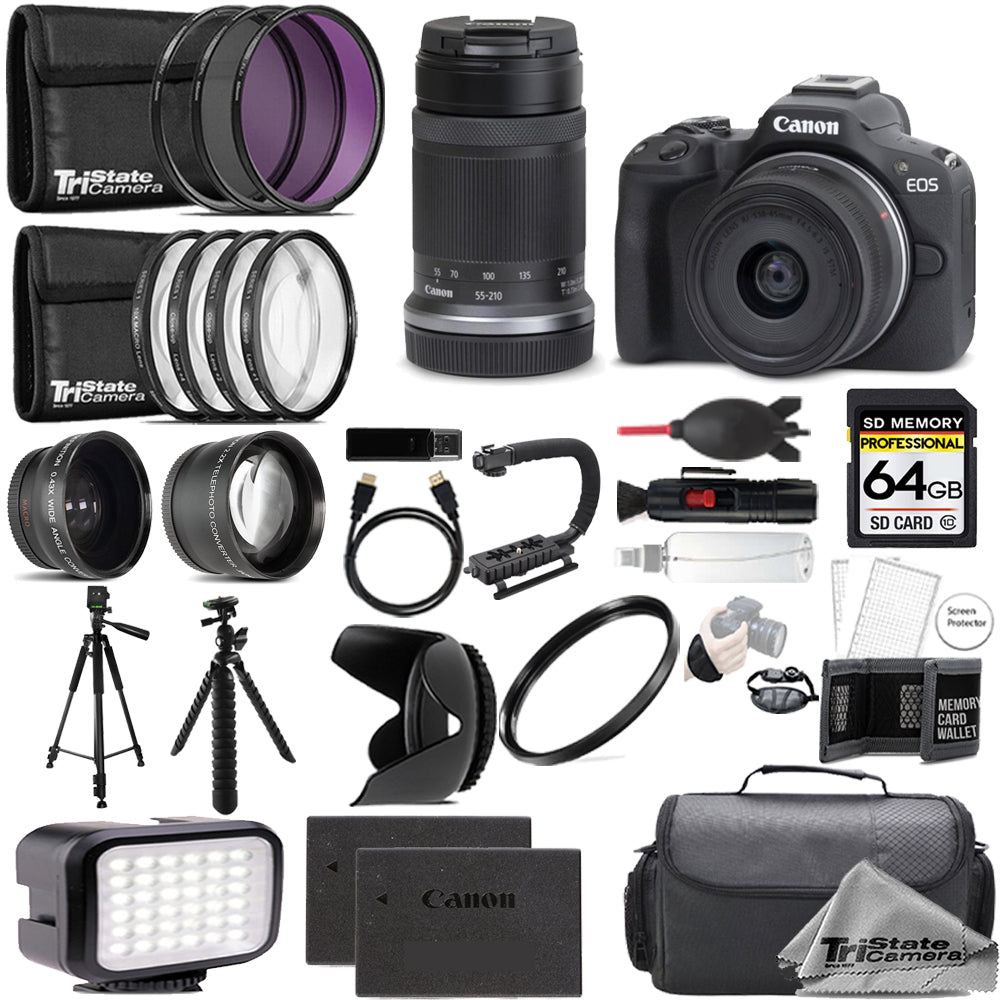Canon EOS R50 Mirrorless Camera w/ 18-45mm IS STM & 55-210mm IS STM Lenses (Black) + 64GB + Extra Battery+ 9 PC Filter- ULTIMATE Kit