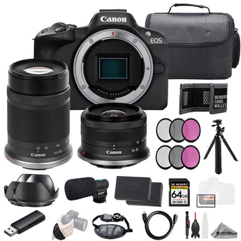 Canon EOS R50 + 18-45mm & 55-210mm Lenses (Black) + Mic +64GB +Ext Bat+3 PC Filter- Kit