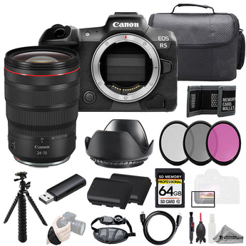 About Canon EOS R5 + RF 24-70mm f/2.8L IS USM Lens +64GB + Ext Bat+ 3 PC Filter- Kit
