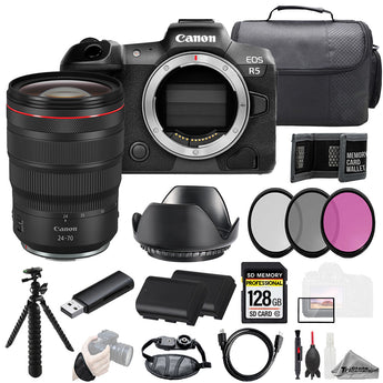 About Canon EOS R5 + RF 24-70mm f/2.8L IS USM Lens 128GB + Ext Bat+ 3 PC Filter- Kit