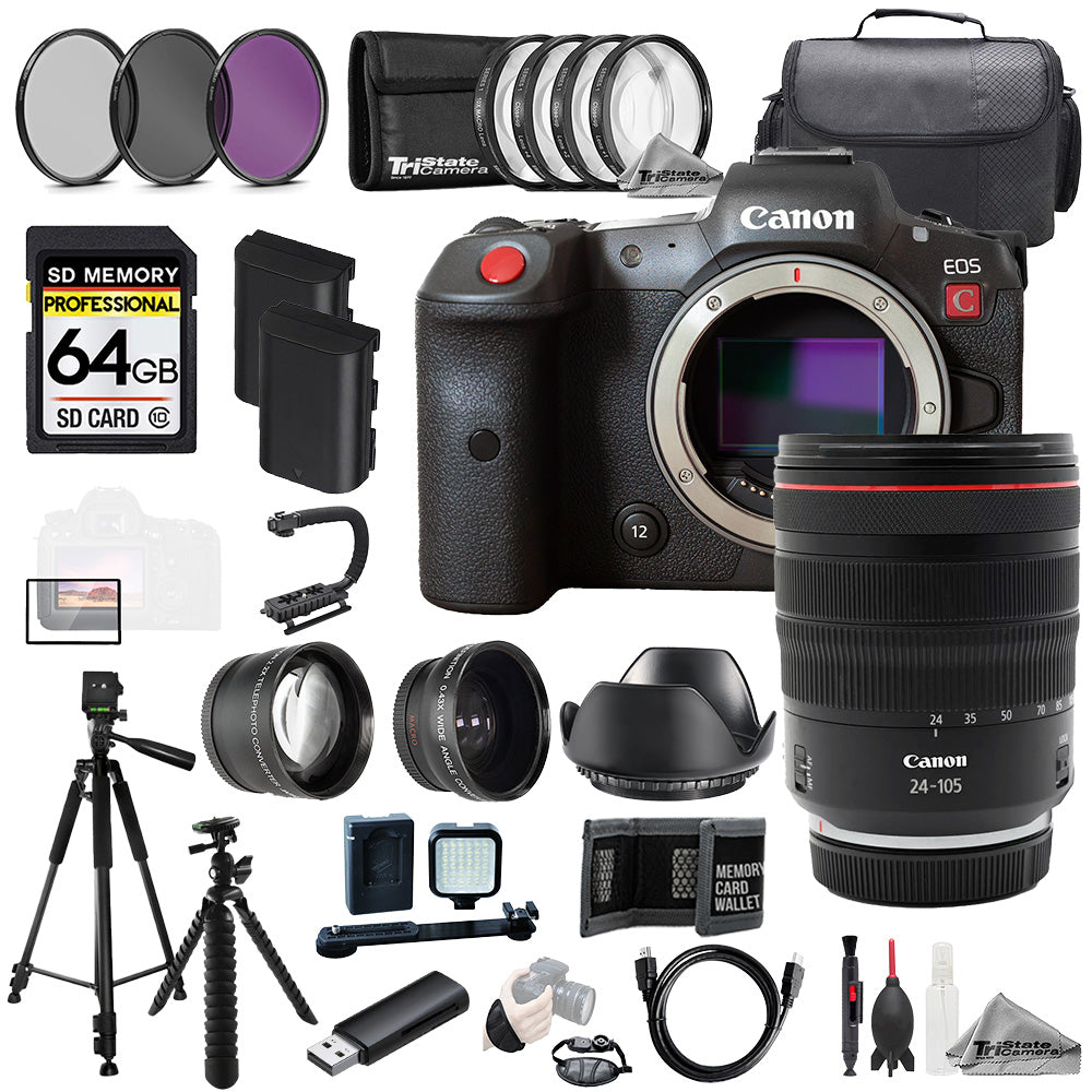 About Canon EOS R5 C Camera + 24-105mm STM Lens +64GB +Ext Bat+ 9 PC Filter-MEGA Kit
