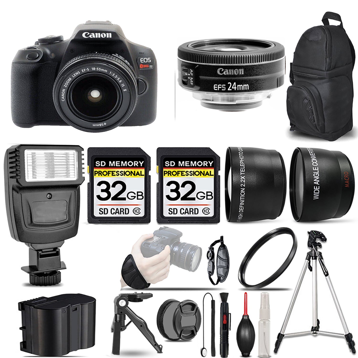 About Canon EOS Rebel T7 with 18-55mm Lens + 24mm f/2.8 STM Lens + Flash + 64GB - Kit