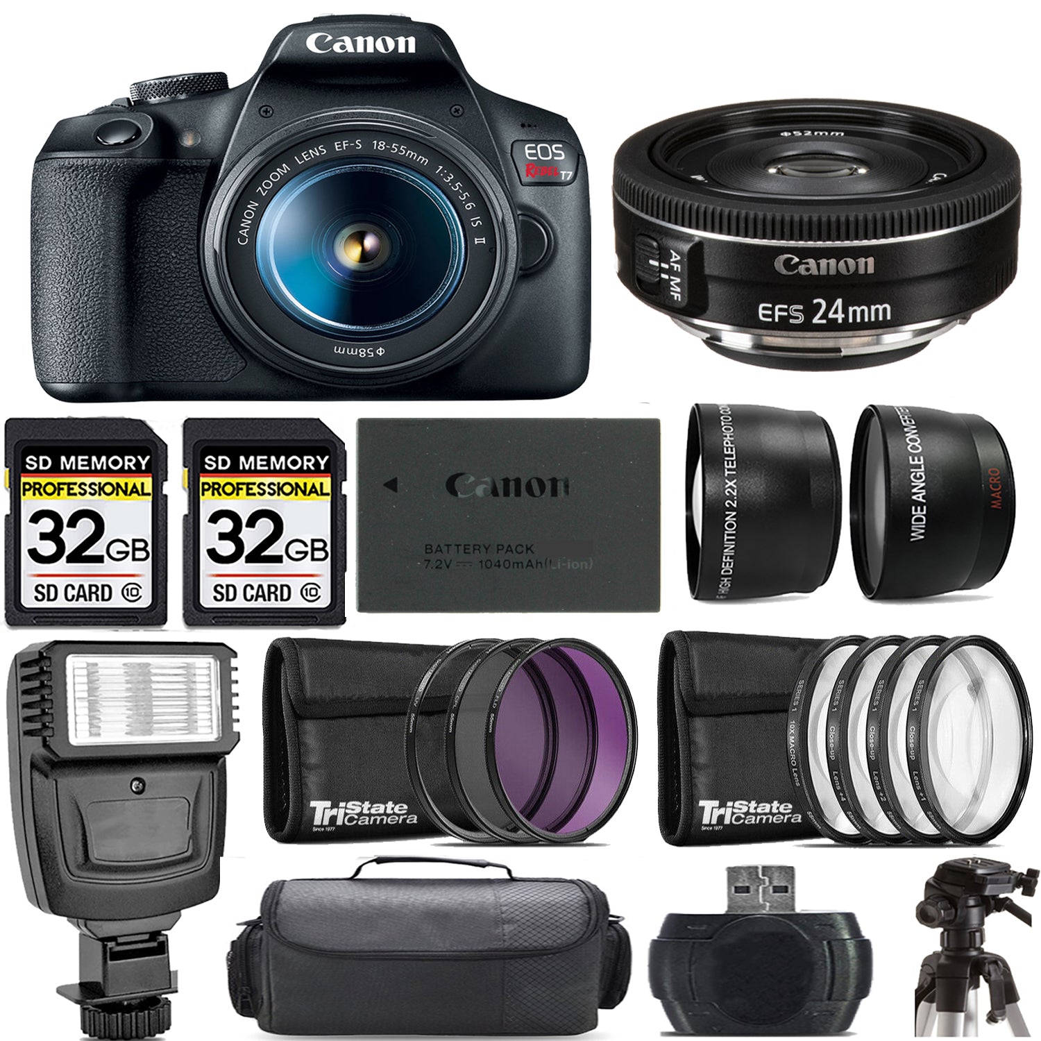 About Canon EOS Rebel T7 with 18-55mm Lens + 24mm f/2.8 STM Lens + Flash - Kit
