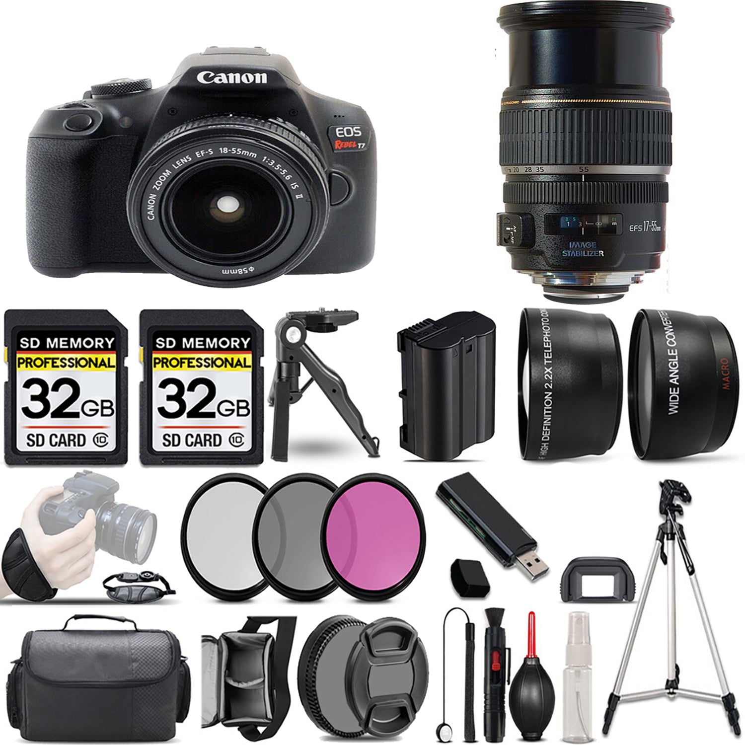 About Canon EOS Rebel T7 with 18-55mm Lens + 17-55mm f/2.8 IS USM Lens + 3 Piece Filter Set + 64GB