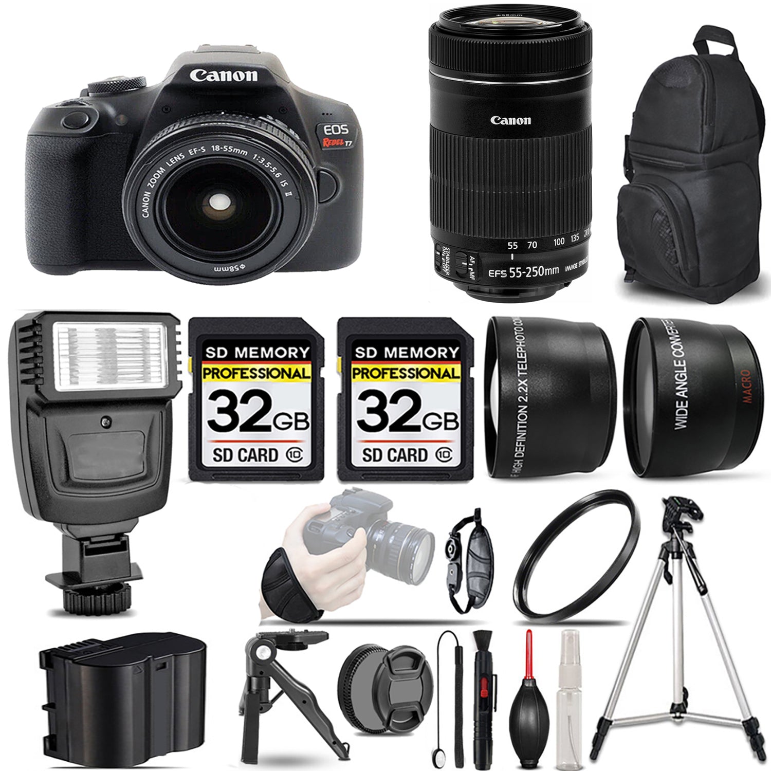About Canon EOS Rebel T7 with 18-55mm Lens + 55-250mm f/4-5.6 IS STM Lens + Flash + 64GB - Kit