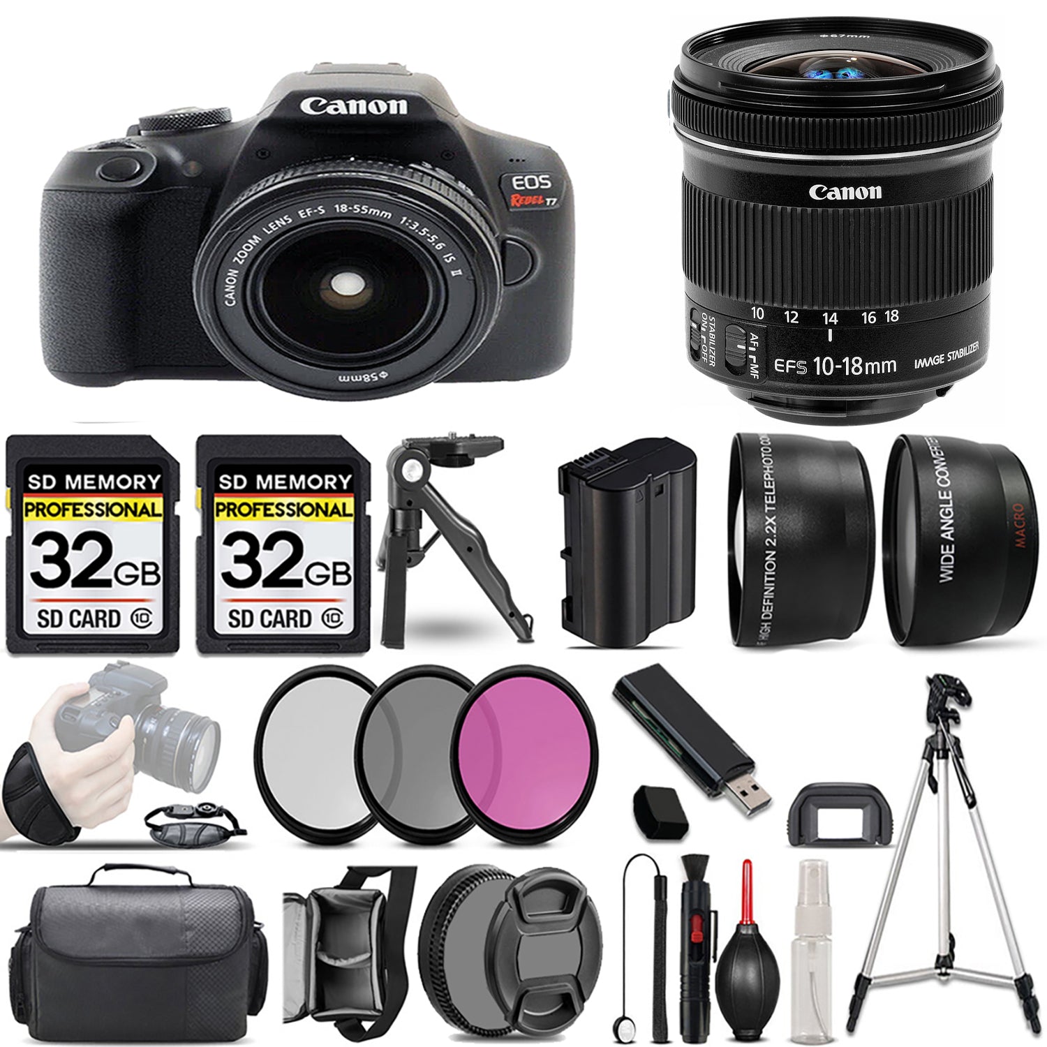 About Canon EOS Rebel T7 with 18-55mm Lens + 10-18mm IS STM Lens + 3 Piece Filter Set + 64GB
