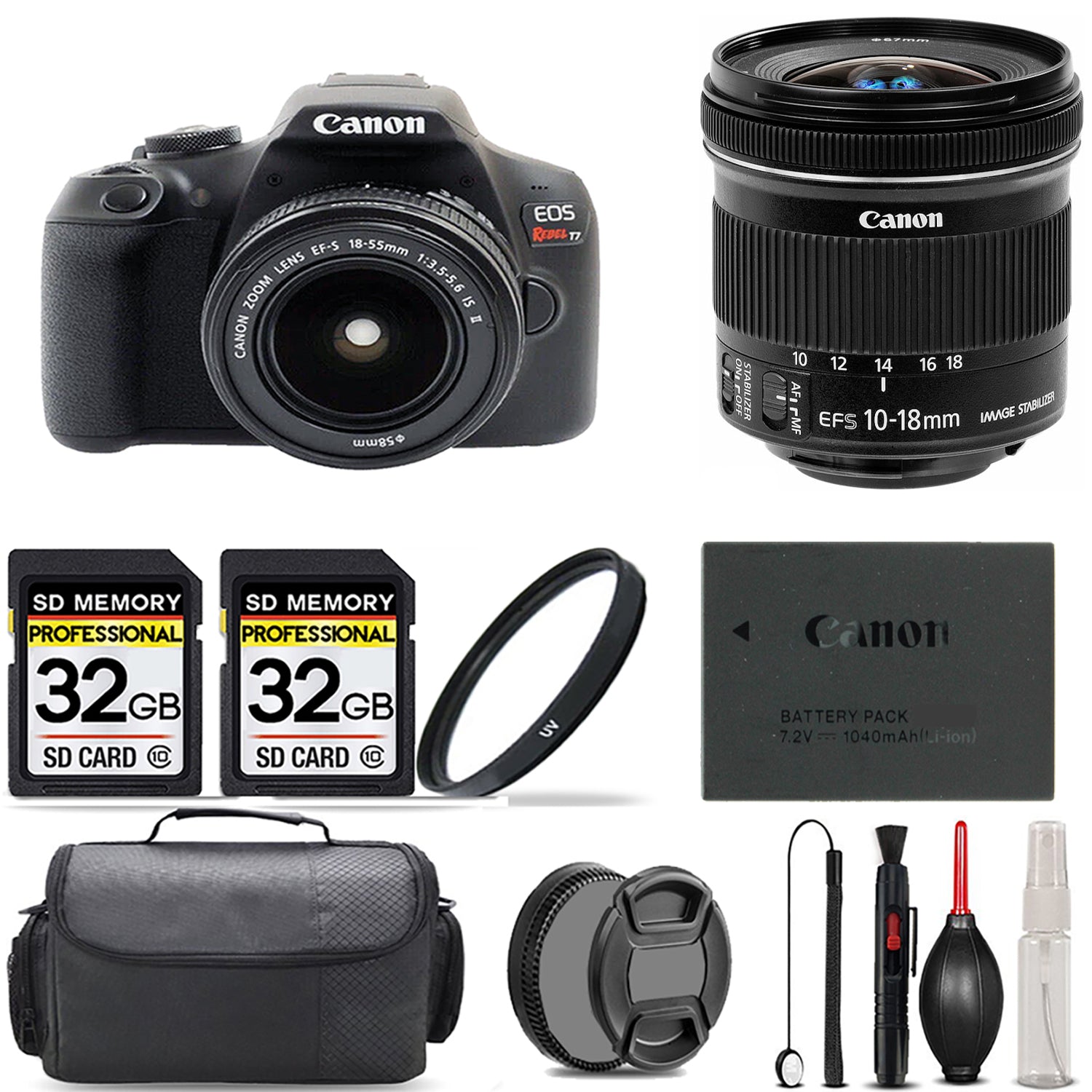 Canon EOS Rebel T7 with 18-55mm Lens + 10-18mm IS STM Lens + UV Filter + 64GB + Bag Specifications
