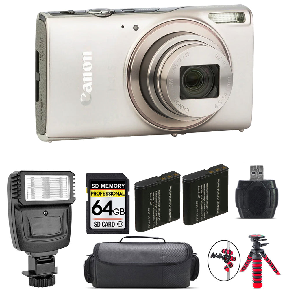 Canon PowerShot IXUS 285 HS Digital Camera (Silver) + Extra Battery + Flash - 64GB Kit
