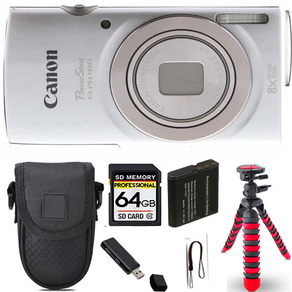 Canon PowerShot ELPH 180 Camera (Silver) + Spider Tripod + Case - 64GB Kit