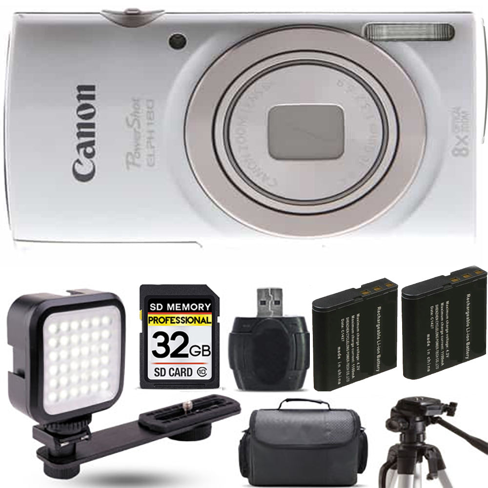Canon PowerShot ELPH 180 Camera (Silver) + Extra Battery + LED - 32GB Kit