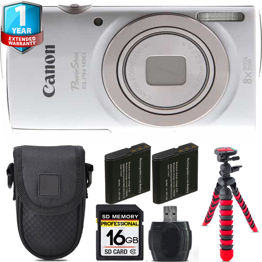 Canon PowerShot ELPH 180 Camera (Silver) + Extra Battery +1 Yr Warranty + Case -16GB