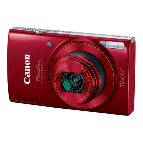 A pocketable point-and-shoot with versatile zoom lens, the red PowerShot ELPH 190 IS Digital Camera from Canon is a sleek, convenient camera featuring a 20.0MP 1/2.3" CCD sensor and DIGIC 4+ image processor. The sensor and processor combine to afford notable image quality and sensitivity to ISO 1600, as well as the ability to record HD 720p videos at 25 fps. A 10x optical zoom lens permits working with a variety of subjects, ranging from near to far, and an Intelligent IS image stabilization system compensates for the effects of camera shake to produce sharper handheld photos. A 2.7" 230k-dot LCD monitor is available for composing your shots and reviewing imagery, and built-in Wi-Fi with NFC allows for wireless transferring of photos and movies to mobile devices. Rounding out the ELPH 190 IS' feature-set, the camera also sports a Smart AUTO mode for intelligently selecting exposure settings, Scene Modes to creatively affect the look of images, ECO Mode to save on battery life, and a dedicated Help Button for learning more about the specific camera controls.