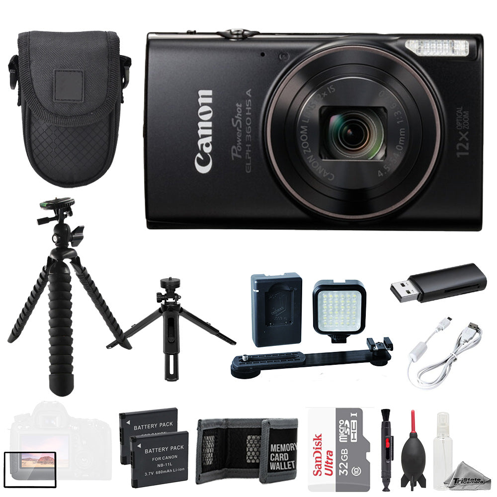 About Canon PowerShot ELPH 360 HS A Digital Camera (Black) + 32GB + Ext Batt+ LED Light- ULTIMATE Kit