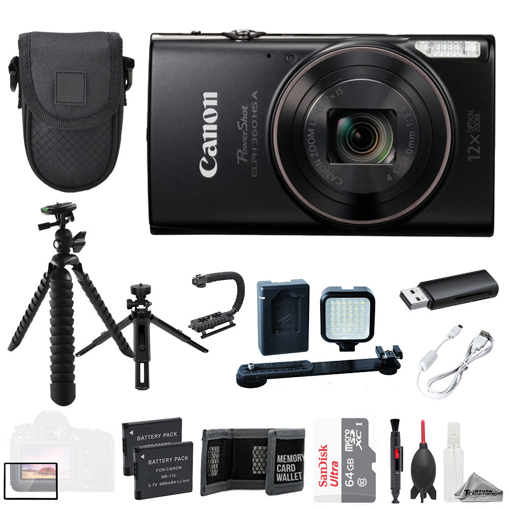 About Canon PowerShot ELPH 360 HS A Digital Camera (Black) + 64GB + Ext Batt+ LED Light- ULTIMATE Kit
