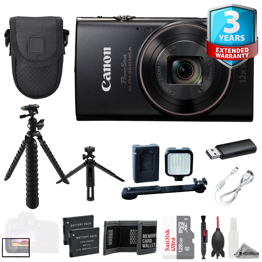 About Canon PowerShot ELPH 360 HS A Digital Camera (Black) + 128GB+Ext Batt+3 YR Warranty-ULTIMATE Kit