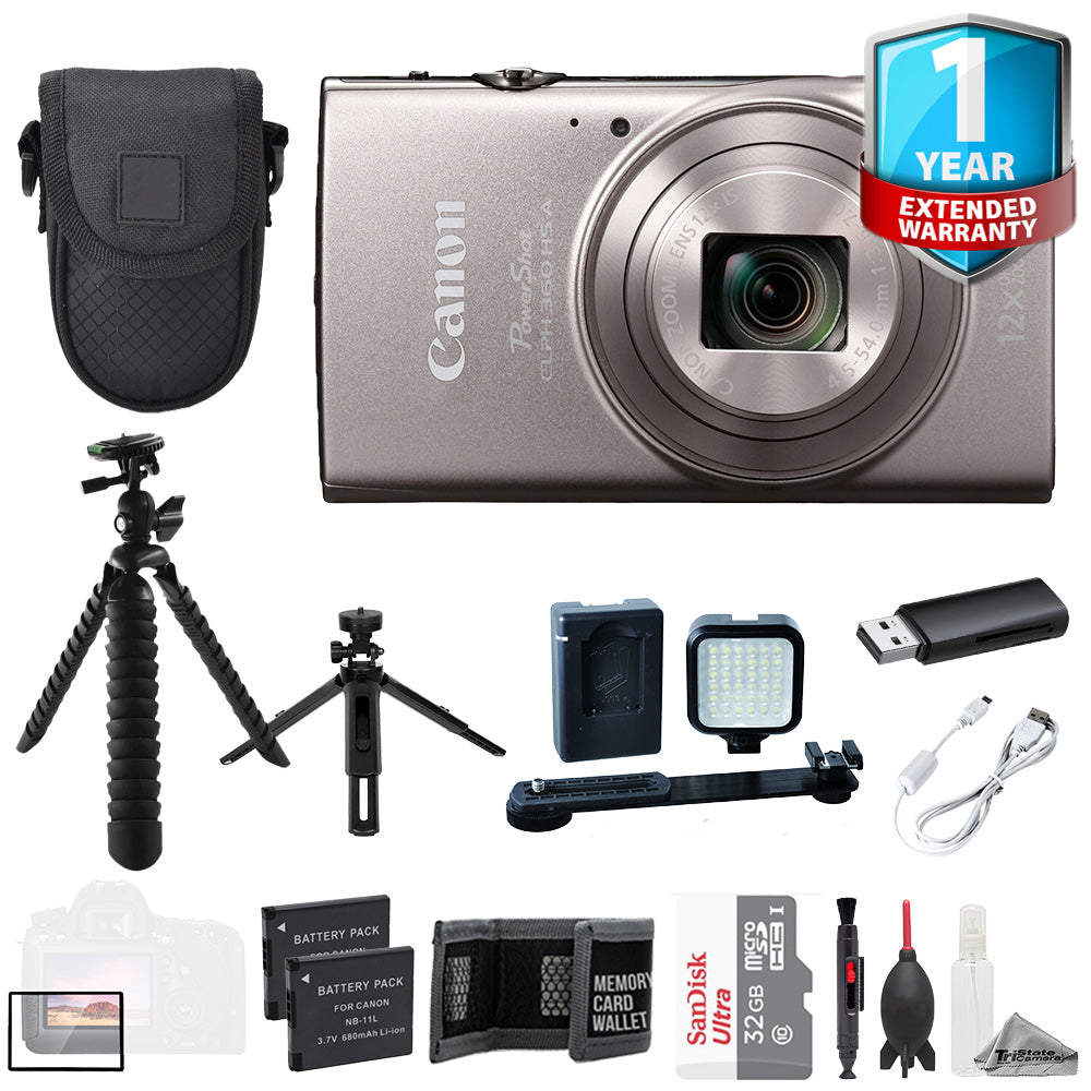 About Canon PowerShot ELPH 360 HS A Digital Camera (Silver) +32GB + Ext Batt+1Yr Warranty-ULTIMATE Kit