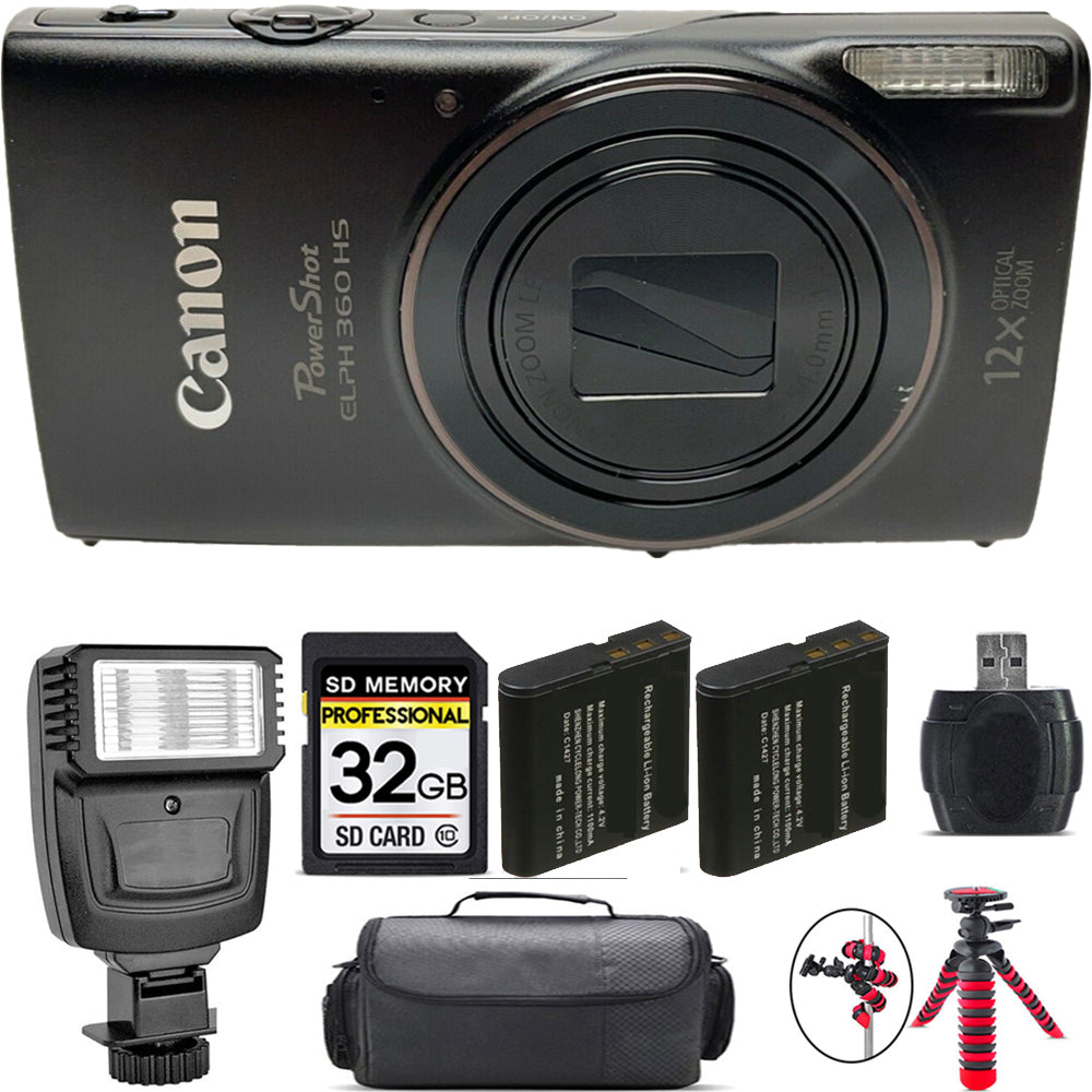 Canon PowerShot ELPH 360 Camera (Black) + Extra Battery + Flash - 32GB Kit