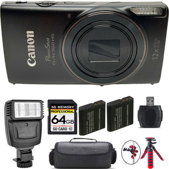 Canon PowerShot ELPH 360 Camera (Black) + Extra Battery + Flash - 64GB Kit