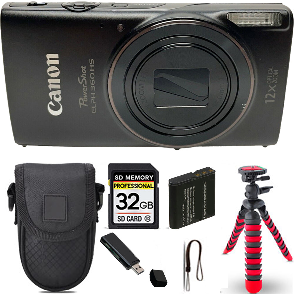Canon PowerShot ELPH 360 Camera (Black) + Spider Tripod + Case - 32GB Kit