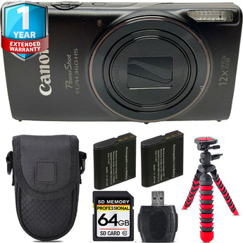 Canon PowerShot ELPH 360 Camera (Black) + Extra Battery +Tripod + 1 Yr Warranty -64GB Kit