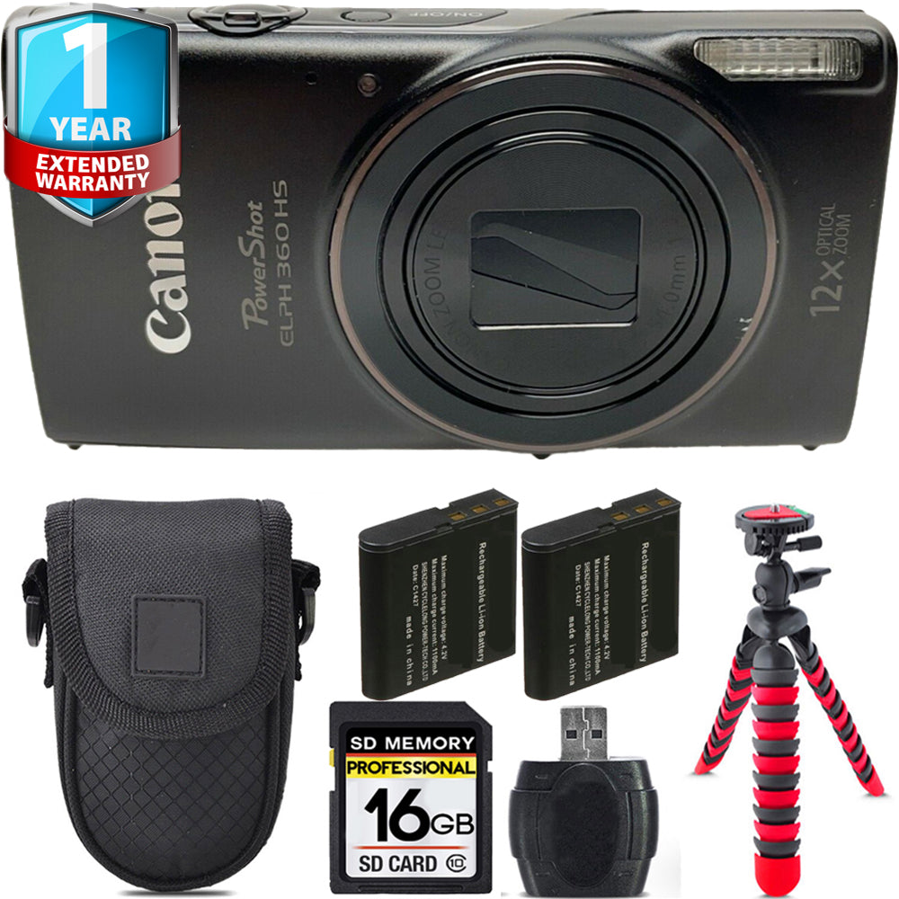 Canon PowerShot ELPH 360 Camera (Black) + Extra Battery +1 Yr Warranty + Case -16GB