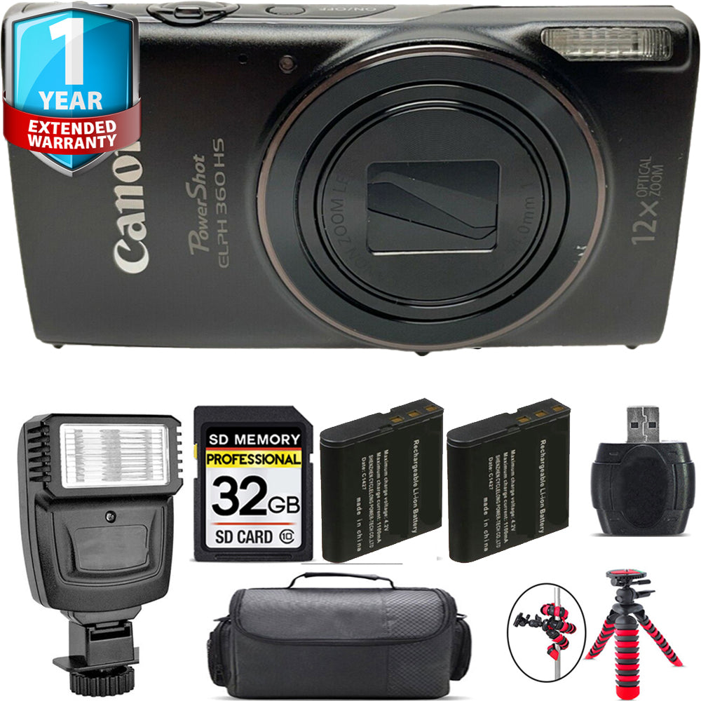 Canon PowerShot ELPH 360 Camera (Black) + Extra Battery + 1 Yr Warranty + 32GB