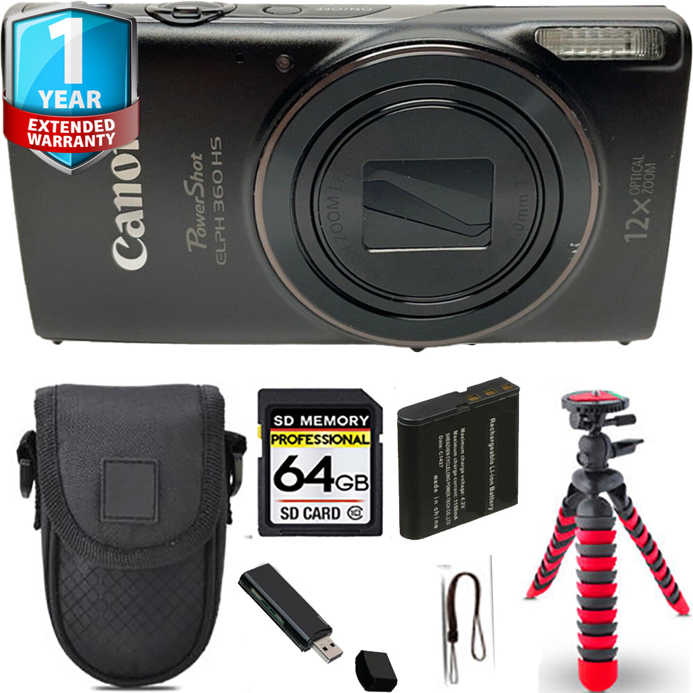 Canon PowerShot ELPH 360 Camera (Black) + Spider Tripod + 1 Yr Warranty - 64GB
