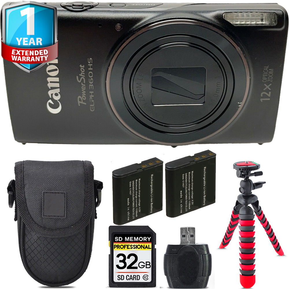 Canon PowerShot ELPH 360 Camera (Black) + 1 Yr Warranty +Tripod + Case -32GB Kit