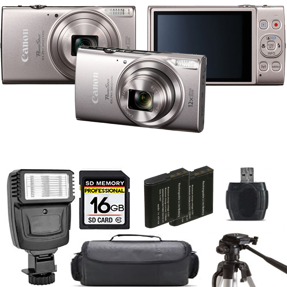 Canon PowerShot ELPH 360 Camera (Silver) + Extra Battery + Flash - 16GB Kit