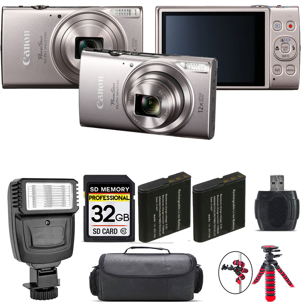 Canon PowerShot ELPH 360 Camera (Silver) + Extra Battery + Flash - 32GB Kit