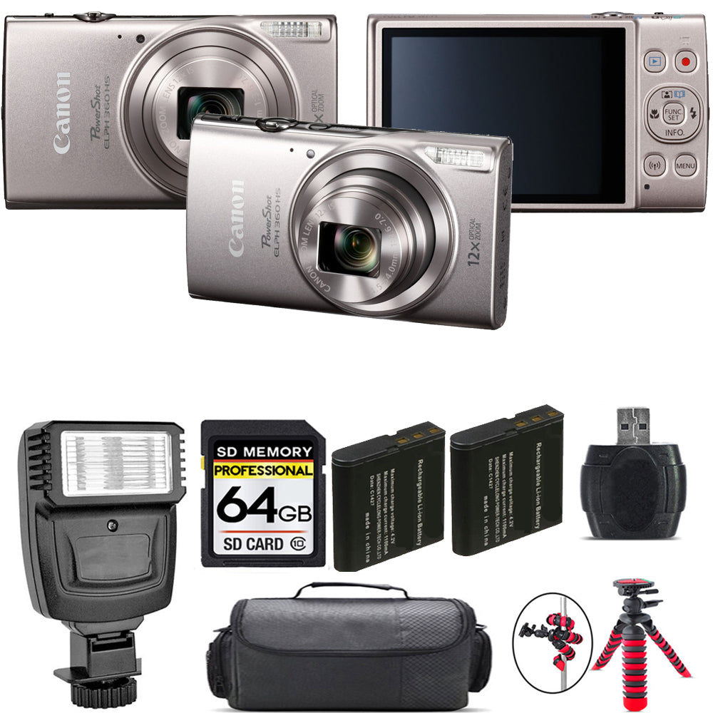 Canon PowerShot ELPH 360 Camera (Silver) + Extra Battery + Flash - 64GB Kit