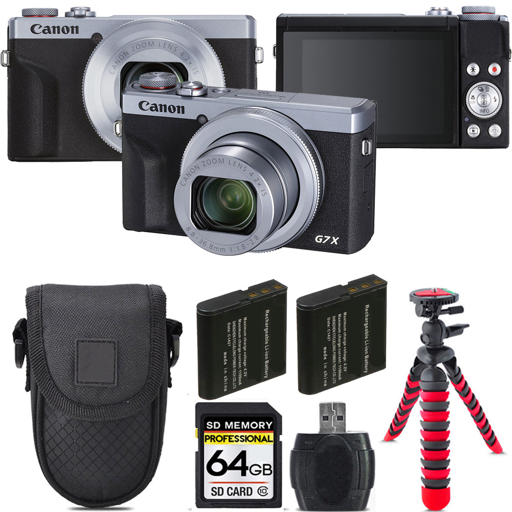 Canon PowerShot G7 X Mark III Digital Camera (Silver) + Extra Battery +Tripod + Case -64GB Kit