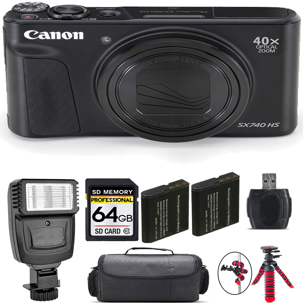 Canon PowerShot SX740 HS Digital Camera (Black) + Extra Battery + Flash - 64GB Kit