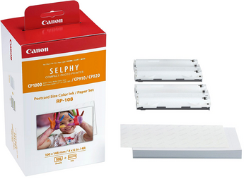 The Canon RP-108 High-Capacity Color Ink/Paper Set is a paper and ink pack for the SELPHY CP910 printer. It offers 108 sheets of postcard-size 4 x 6" paper as well as two color ink ribbons for printing. This high-capacity cartridge allows users to load up to 54 sheets of paper at once.Canon RP-108 High-Capacity Color Ink/Paper Set for SELPHY CP910 8568B001 Specifications
