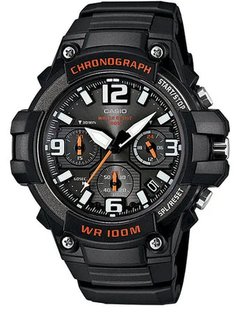 These lightweight sporty analogs feature aluminum cases, mineral glass are 100M water resistant, making them a perfect choice for any sports wear. Features resin bands and a chronograph function for timing. Featuring a Black Resin Band and Black Face with Orange and White Accents. Date Display and 30 minute Stopwatch.Casio Men's MCW100H-1AV Heavy Duty Chrono Analog Wrist Watch (Black) Specifications