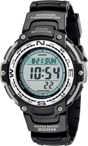 Casio Twin Sensor Watch. This watch has twin sensor capability Digital Compass and Thermometer. It also is low temperature resistant. It has EL Backlight with World time, 5 daily alarms w/Snooze Alarm, 1/100 second stopwatch and countdown timer. 200M Water Resist. Black Band. Measuring unit: 1 degree 10 seconds continuous measurement Graphic direction pointer Bearing Sensor Correction Magnetic Declination correction Thermometer Display range: -10 to 60 C (14 to 140 F) Display unit: 0.1 C (0.2 F) EL Backlight with Afterglow World Time 29 times zones (48 cities), city code display, daylight saving on/off 4 Daily Alarms and 1 Snooze Alarm Countdown Timer Measuring unit: 1 second Countdown range: 24 hours Countdown start time setting range: 1 minute to 24 hours (1-hour increments and 1-minute increments) Others: Auto Repeat 1/100 second stopwatch Measuring capacity: 59'59.99" Measuring modes: Elapsed time, split time, 1st-2nd place times Hourly Time Signal Auto Calendar (pre-programmed until the year 2099) 12/24 Hour Format Button operation tone on/off Accuracy: +/-20 seconds per month (with no signal calibration) Storage Battery CR2025 Approx. battery life: 3 yearsCasio Men's SGW100-1V Twin Sensor Digital Sport Watch (Black ) Specifications