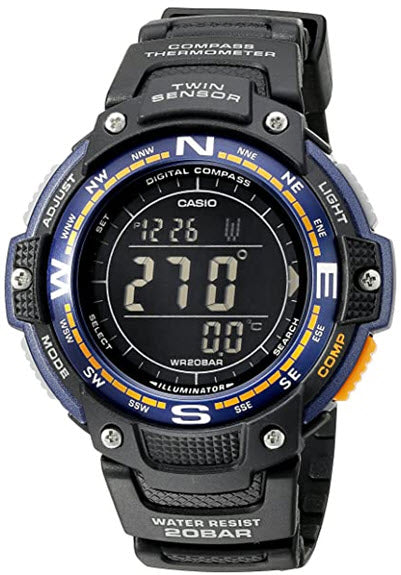 These new models pack Twin Sensor and temperature and direction readings into a 200M water resistant design that is perfect for sports, work, or other activities that involve water. In addition to world time, stopwatch alarm, and other basic timekeeping functions, these models also include a direction sensor and temperature sensor. Direction readings and time are indicated by large, easy-to-read figures. A large LCD is divided into three segments for a clear, easy-to-understand presentation of data. Mineral glass is used to protect against scratching.Twin Sensor Watch BluGrn Light Specifications