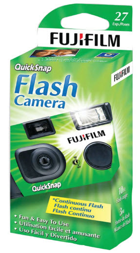 A convenient one-time-use disposable camera for both indoor and outdoor shooting situations, the QuickSnap Flash 400 from FUJIFILM is loaded with a roll of 27-exposure Fujicolor Superia X-TRA 400 color negative film for bright, vivid results in a variety of lighting conditions. The compact, portable camera design incorporates a fixed-focus, wide-angle lens and a matching optical viewfinder for making accurate compositions. Additionally, to suit working in low lighting, a built-in flash with a 10' range is featured, and offers automatic recharging, continuous flash operation, and manual on/off control.Fujifilm QuickSnap Flash 400 One-Time-Use Disposable Camera (27 Exposures) 7033661 Specifications
