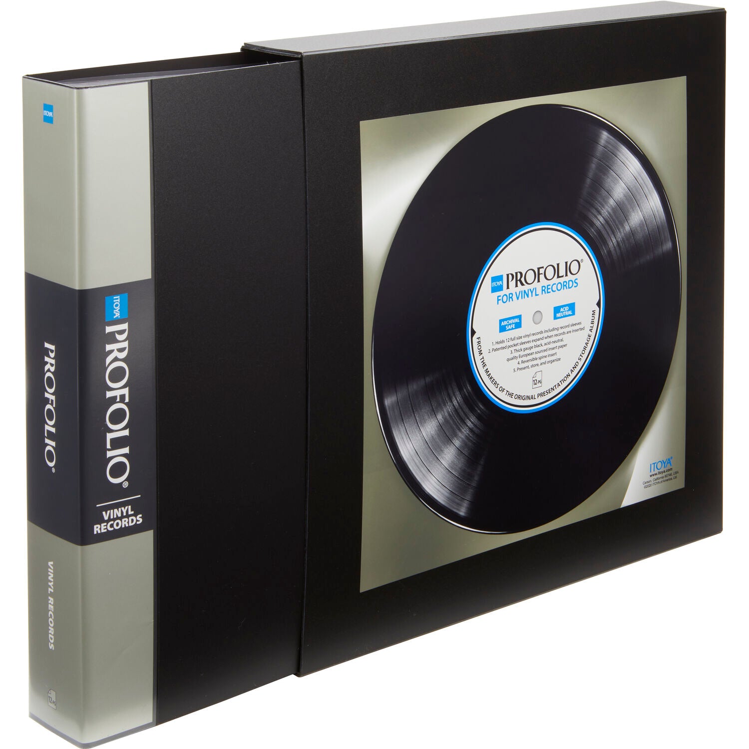 The ProFolio for Vinyl Records from Itoya holds twelve standard vinyl records. One record fits perfectly in each of the twelve acid-free, polypropylene pockets, and each pocket has a patented gusset that expands when the record sleeve is inserted. The pockets stay flat and don't buckle or twist, allowing each page to be turned effortlessly as you flip through it. Thick gauge, black, acid-neutral paper is included in each pocket to keep the backsides of your record sleeves archival-safe and secure. The ProFolio has a customizable, reversible spine for easy labeling and comes with a durable, black, polypropylene, acid-free sleeve to protect the entire album as it sits on your bookshelf or during transport.Itoya ProFolio for Vinyl Records IC-12-RC Specifications