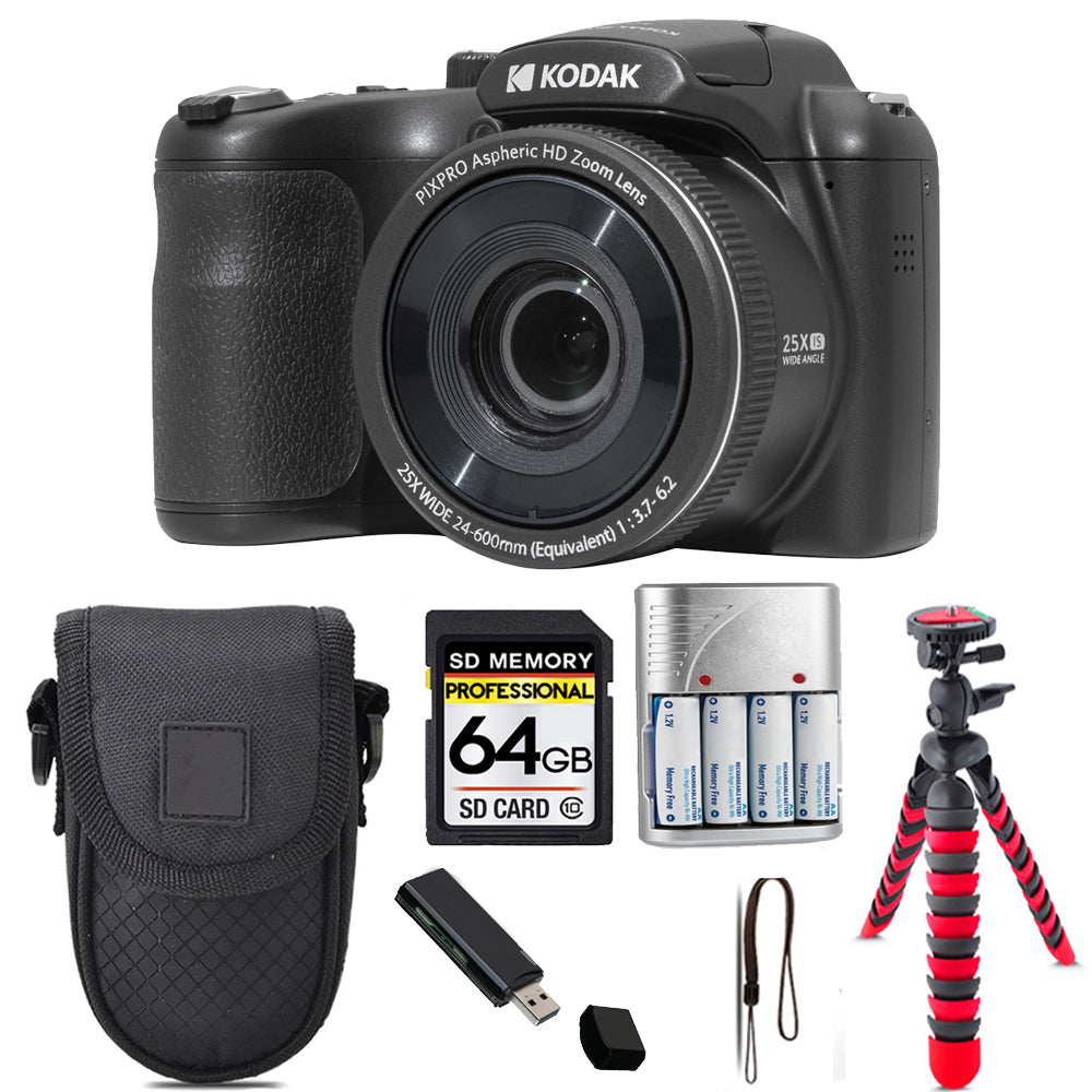Kodak PIXPRO AZ255 Digital Camera (Black) + Tripod + Case - 64GB Kit