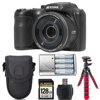 Kodak PIXPRO AZ255 Digital Camera (Black) + Extra Battery +Tripod + Case -128GB Kit