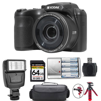 Kodak PIXPRO AZ255 Digital Camera (Black) + Extra Battery + Flash - 64GB Kit