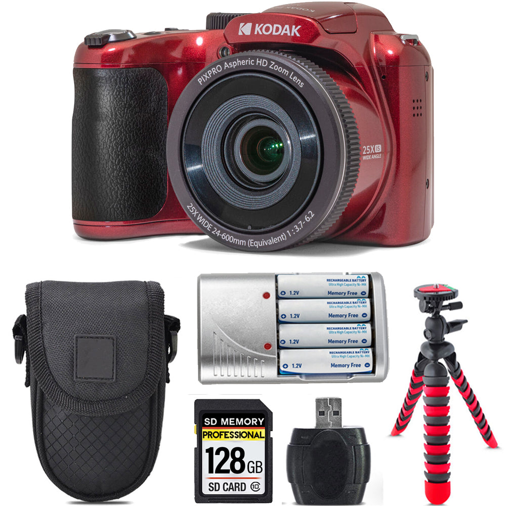 Kodak PIXPRO AZ255 Digital Camera (Red) + Extra Battery +Tripod + Case -128GB Kit